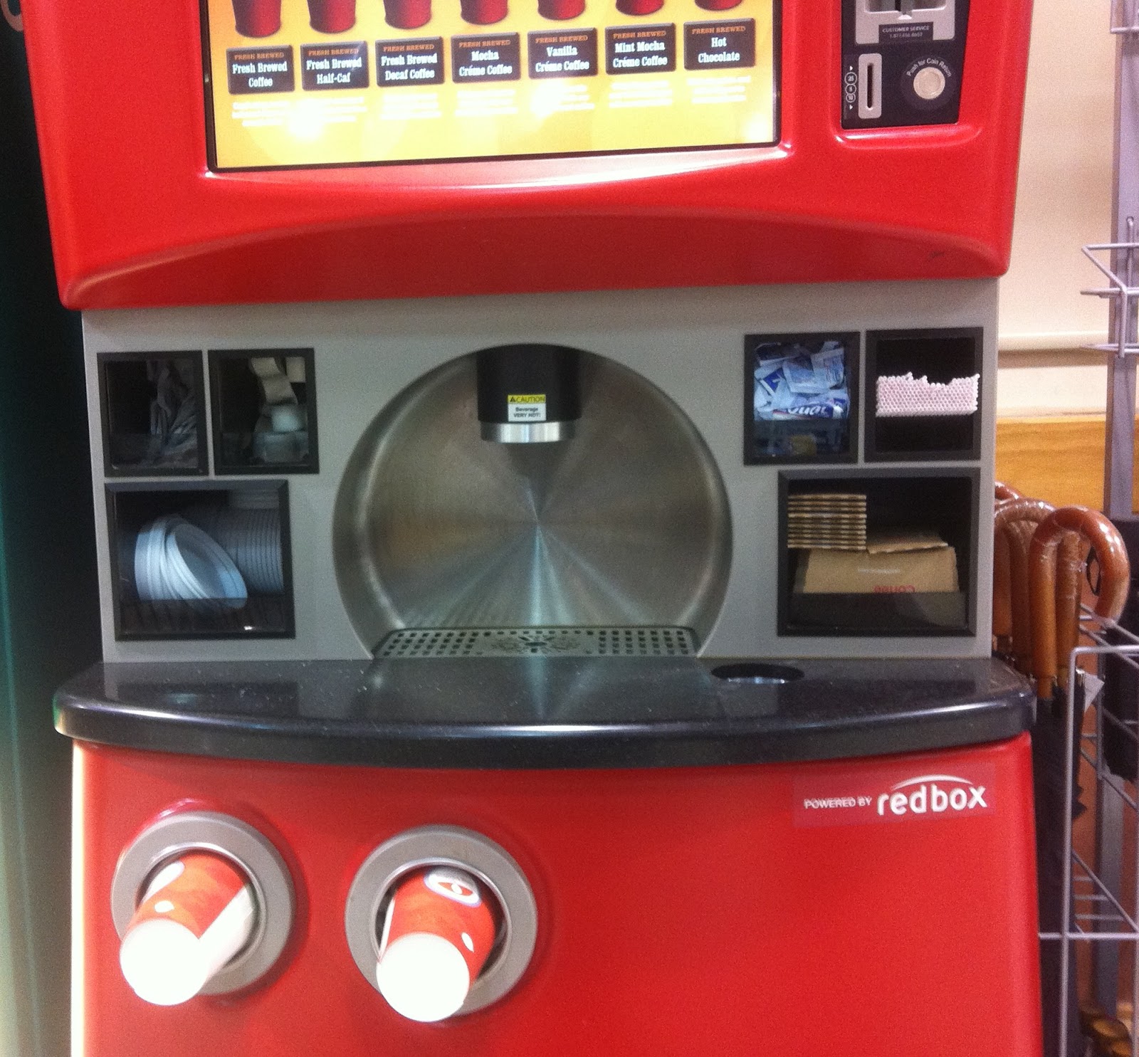 Here’s a picture of one of the coffee machines in the wild in Virginia, via Patrick Seitz. Note the label saying it’s “powered by Redbox” — underscoring the fact that the Redbox brand has, in many ways, become bigger than the Coinstar brand.